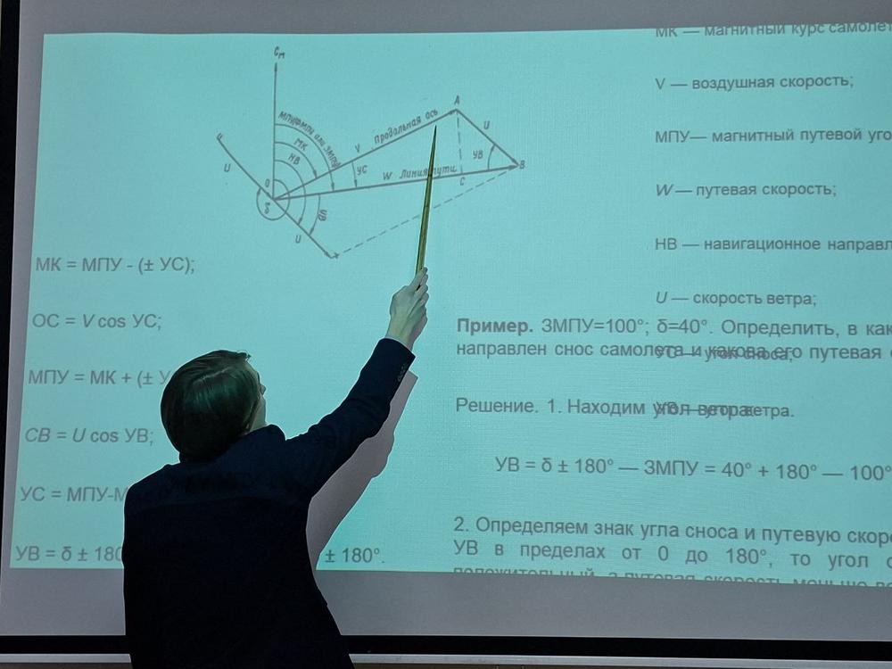 Студенты решали задачи, связанные с полётом самолётов по различным траекториям, рассчитывали расход топлива, угол сноса самолёта и скорость при различных погодных условиях. Говорили о влиянии рельефа местности на полёт.