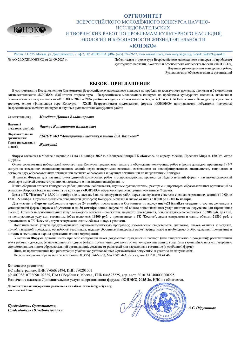 💪💪💪Студент и преподаватель ГБПОУ МО "Авиационный техникум имени В.А.Казакова" приглашены для участия в финале Всероссийского молодежного форума ЮНЭКО Студент Мехейкин...